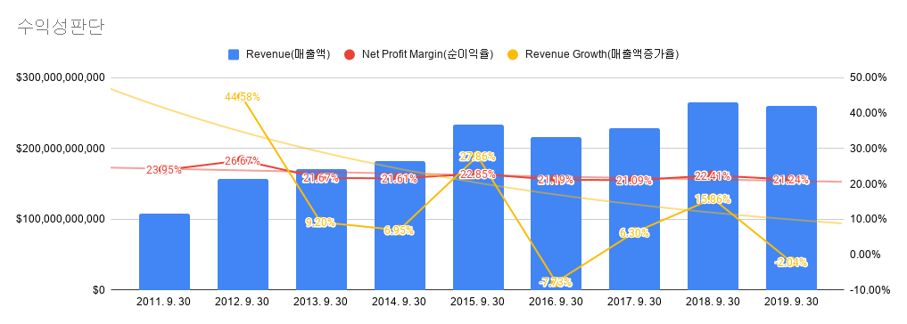 10년 전에 비해 매출액이 무려 2.5배나 증가했습니다. 스티븐 잡스에 이어 팀쿡도 잘 이끌어가 가네요 순이익율은 20% 이상 꾸준히 이익을 내고 있고 매출 증가율이 감소하고 있지만 전체적으로 우상향을 하고 있는데 역시 전세계 1위 기업입니다.