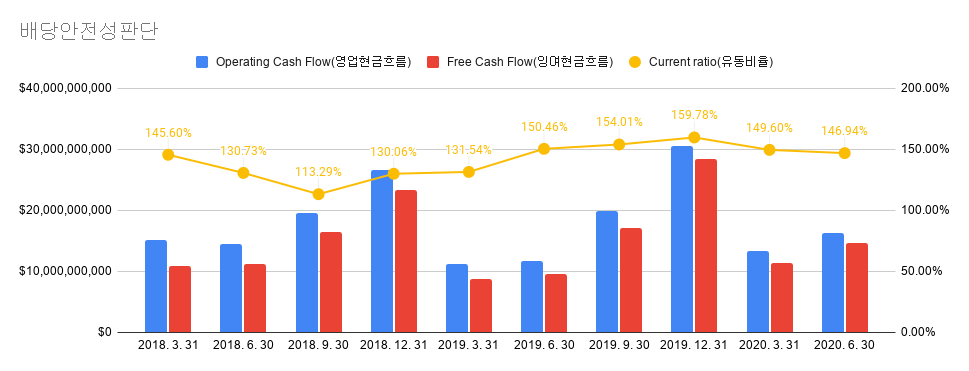 현금흐름은 굳이 언급할 필요가 없습니다. 영어현금흐름과 거의 차이가 없고 유동비율도 150%정도이니 코로나로 갑자기 영업을 하지 못할 정도로 어려운 상황이 전혀 없네요 매우 건강한 기업이라고 볼 수 있습니다.