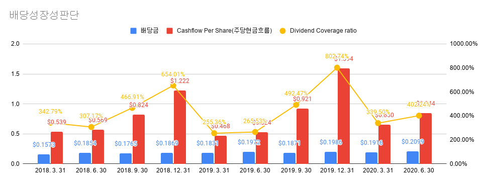 당연히 배당 성장성은 매년 10% 증가하겠다고 봐도 무방할 듯합니다. 주당 현금흐름도 너무 좋고 배당커버리지가 400%이상이니 배당 컷이나 삭감은 생각해 볼 수 없겠네요 애플과 같은 재무제표 구조이면 마음 놓고 배당을 받을 수 있겠네요
