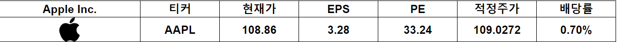 주당현금흐름이 배당금에 비해 400%이상 상회하므로 역시 배당 삭감은 의심할 필요는 없고 매 분기마다 증가되는 배당을 받을 수 있을 듯합니다. 단 배당금이 너무 적지만 주가가 올라 시세차익을 본다면 충분히 매수할 기업이라고 생각합니다. 요즘 애플 주가가 오르지 않아 약 108달러 정도하는데 개인적으로 적정한 주가라 판단이 됩니다. 여유 돈이 있으면 매수해야하는 시기입니다.