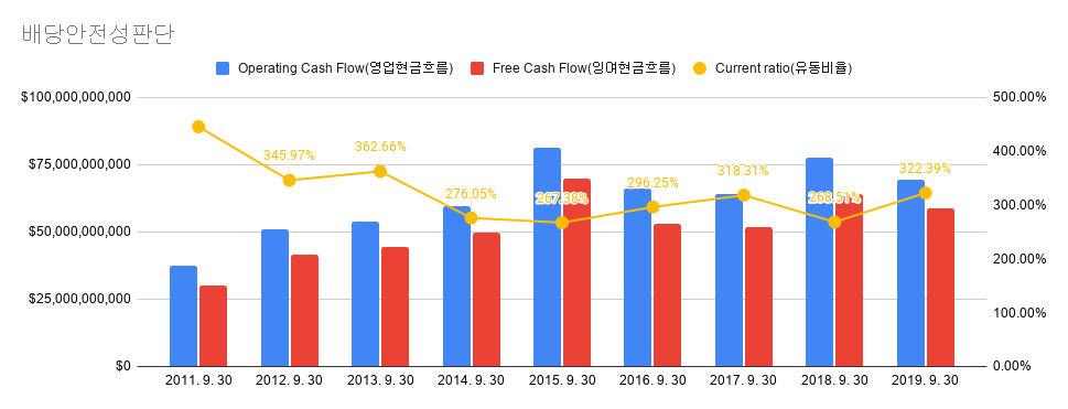 잉여현금흐름도 상당히 많은 비중을 차지하고 있네요 유동비율도 300%가 넘어가고 기업내에 저렇게 많은 돈 흐름은 처음봅니다. 개인적으로 배당률을 더 올려 줬으면 하는 소망이 있네요 돈도 많은데...