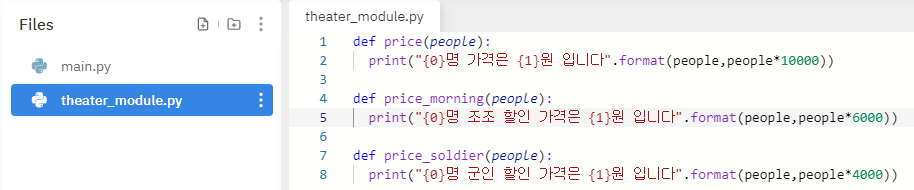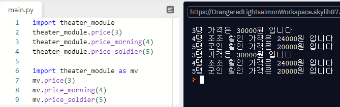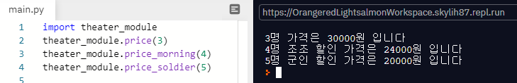 다시 메인 파일로 돌아갑니다. 외부에 있는 모듈을 불러들이기 위해 import라는 명령어를 사용합니다. import 다음에 불러 읽을 파일의 제목을 알려주어야 합니다. theater_module이라고 했으므로 제목을 적고 함수를 불러와 사용하면 됩니다.