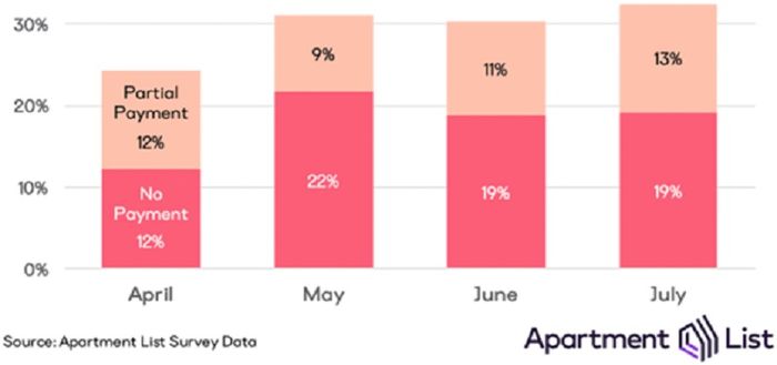 백인을 빼고 흑인, 아시아 유색인 종순으로 집세 체납 비율이 높아지고 있습니다. 벌써 20%가 넘었습니다. 빅쇼트에서 크리스천 베일이 초반에 이런 이야기를 합니다. 주택시장 붕괴! 주택 담보 대출을 받은 사람들이 채무불이행 돈을 못 갚는 비율이 15%가 넘어가면 붕괴할 것이다라고 말이죠. 임대료 체납은 임차인에서 임대인으로 위험이 넘어갑니다. 세입자가 월세를 안 내는데 대출 이자를 어떻게 합니까? 미국은 전세제도가 없습니다. 무조건 렌트 개념입니다. 따라서 도표에서 나온 비율을 보면 백인 빼고 15% 이상 다 넘었습니다. 굉장히 위험한 수준이죠. 내년 1월에 임대료 체납 유예기간을 더 연장해 줄까요?