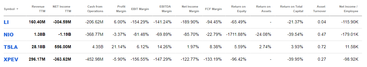 하지만 만약에 중국 전기차 회사 3인방의 매출이 50배 늘어난다고가 정하면 어떨까요? 그러면 니오는 그나마 더 합리적인 가격대로 보이고 샤오펑 조금 어려워 보이고 리오토는 더욱 부담스러운 밸류에이션이 나오게 됩니다. 지금도 시장이 더 오를 것으로 보이고 있어서 받아들이기는 조금은 힘든 수치가 나오고 있습니다. 물론 향후 12개월 성장률을 어떻게 보느냐에 따라 조금씩 달라질 수 있습니다. 포드의 매출을 보면 1300억 달러 수준입니다. 수익성을 살펴보면 아직 니오 샤오펑은 매출총손실이 나오고 있지만 리오토는 벌써 매출총이익으로 전환했습니다. 제조과정을 최적화하고 있는 과정 중에 있습니다. 한 가지 우려스러운 것은 현금이 $1.8억 달러밖에 없다는 것입니다. 리오토는 조금 더 버틸 수는 있겠습니다. 아무래도 현금이 부족하게 되면 샤오펑 입장에서는 추가 증자에 대한 부담이 생길 수 있습니다. 하지만 이런 상황이라면 오히려 증자를 더 기쁘게 받아들일 수도 있지 않을까 생각됩니다.