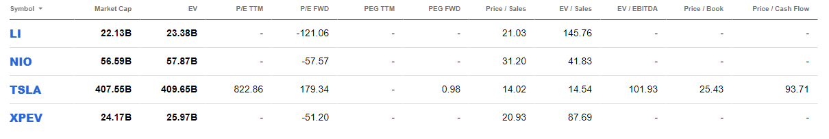 포드는 인력이 세계적으로 17만 명이 있는 회사인데 고작 6천 명 정도의 니오에게 추월을 당하고 있습니다. 그만큼 중국 소비시장에 대한 기대치가 크다고 할 수 있겠습니다. 그러면 현 수준의 밸류에이션은 어떨까요? 공통적으로 나오는 지표는 바로 작년 12개월 매출 대비 가격입니다. 신생 회사들이 많기 때문에 향후 매출에 대한 예상치는 나와 있지 않습니다. 테슬라가 14배 정도인데 고평가라고 얘기하던 사람들이 많이 있는 상황입니다. 테슬라는 향후 12개월로 보면, 약 13.5배 정도가 나와 있어서 크게 다르지 않게 밸류에이션 되고 있습니다. 그런데 니오는 43배 샤오펑 90배, 리오토 154배로 매우 높습니다. 엄청나게 매출이 성장할 것으로 기대가 되지 않는다면 저렇게 고평가 되기는 어려울 것 같습니다.