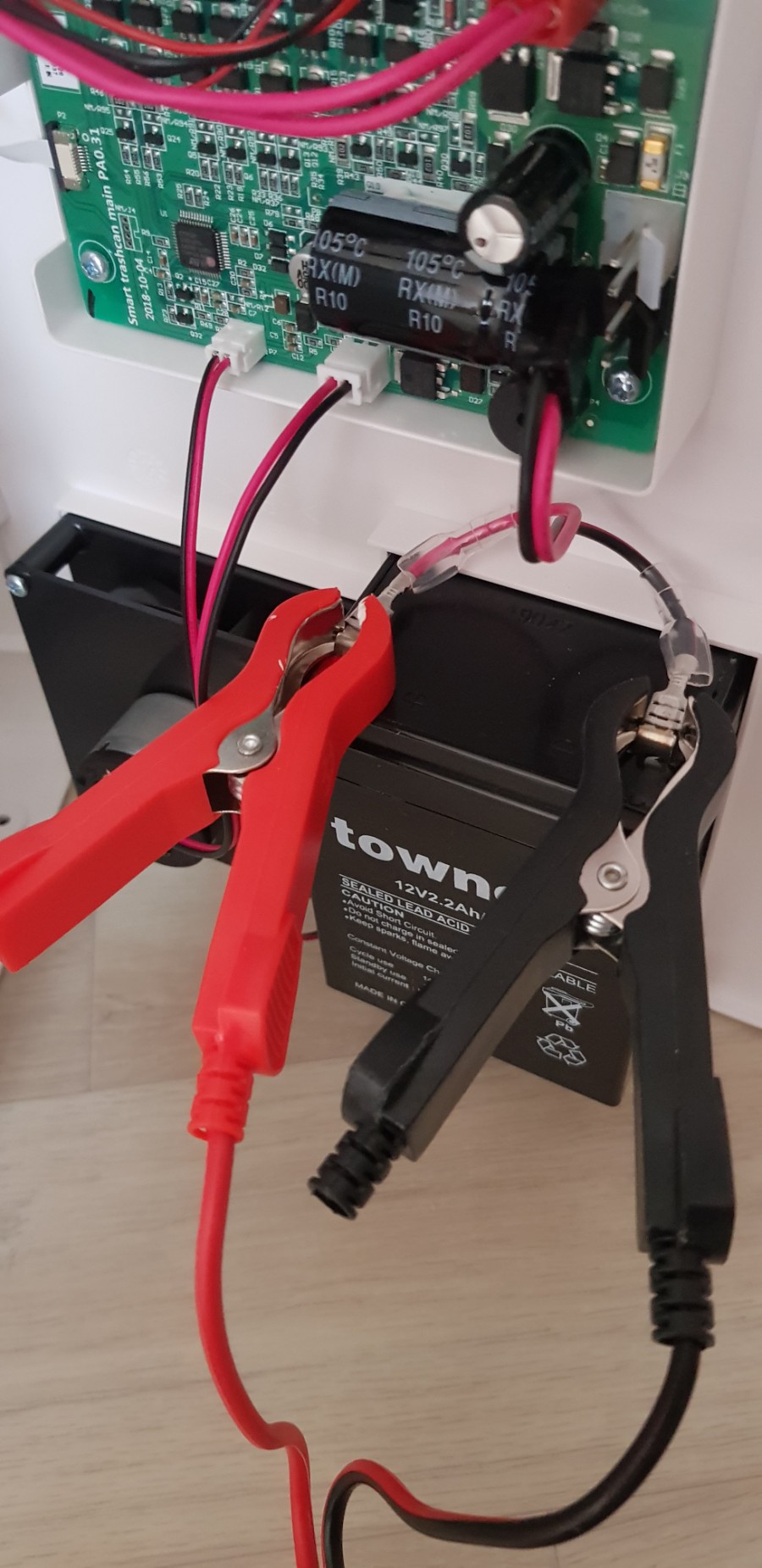 약 30분 후 충전이 다 되었다고 울리네요. (벌써?) 다 조립하고 쓰레기통 문을 열어보니 삑삑삑 소리가 나지 않았습니다. 오~ 충전이 되는구먼 당분간 이렇게 써야겠다며 정리하고 끝났습니다. 전기기사 자격증 공부를 하고 회로를 수리하는 수준까지 올려야 귀찮은 작업을 안 할 듯합니다. 회로 수리는 자격증 취득할 때까지 기다려야겠습니다.