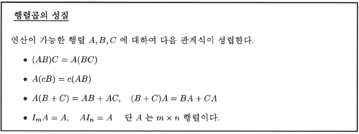 지금까지 살펴본 행렬곱에 대한 성질들을 정리하면 다음과 같다.