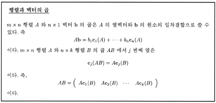 따라서 행렬과 벡터의 곱은 행렬의 열벡터의 일차 결합(linear combination)으로 쓸 수 있다. 이때 일차결합의 계수는 열벡터의 항들이 된다.