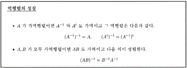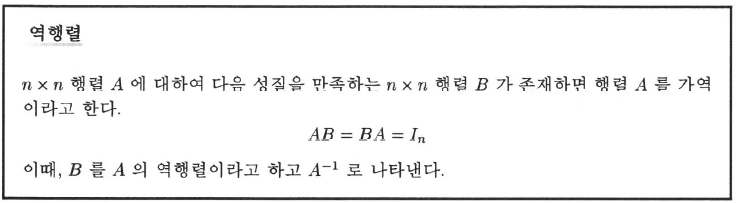 이 성립하는 B가 존재하는가? 만약 이런 성질을 갖는 행렬 B가 존재하면 A는 가역(invertible)라고 하고 B를 A의 역행렬(inverse matrix)이라고 한다. 식(1.10)이 성립하려면 A,B의 크기는 모두 $n \times n$이어야 한다. 지금부터 이 절에서 다루는 모든 행렬은 정방행렬임을 가정한다.