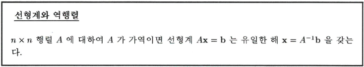 이렇게 선형방정식계를 행렬을 이용하여 나타낸 것을 행렬방정식(matrix equation)이라고 한다.