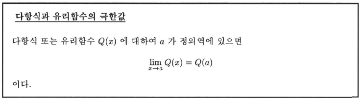 이 성립한다. 마지막으로 유리함수 $Q(x)=\frac{f(x)}{g(x)}$에 대하여 $lim_{x\rightarrow a}g(x)\neq0$이면