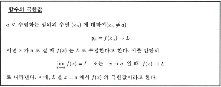 함수의 극한은 다음과 같이 수열의 극한을 이용하여 정의할 수 있다. $a$로 수렴하는 임의의 수열 $(x_n)(x_n\neq a)$에 대하여( $x$가 어떤 방법으로 $a$에 가까워지더라도)