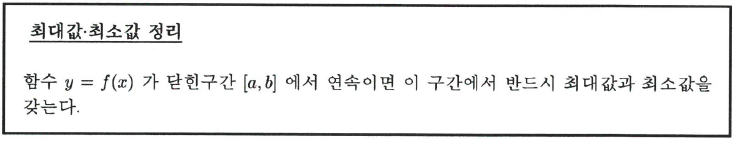 인 $x\in D$가 존재하면 $x=c$에서 최대값(maximum value)을 갖는다고 한다. 최대값, 최소값을 구하는 기본적인 방법은 미분계수를 사용하며 다음 장에서 다루기로 하고 연속함수에 대한 다음 결과로 이 절을 마무리하기로 한다.