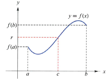 중간값 정리를 기하학적으로 보면 $r$이 $f(a)$와 $f(b)$ 사이의 값이라면 직선 $y=r$과 $y=f(x)$의 그래프는 적어도 한 점에서 만나는 것을 의미한다.