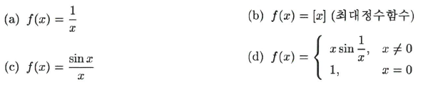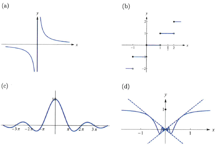 (a),(c)의 경우 0에서 $f$가 정의되지 않으므로 불연속이다. (b)에서는 $\lim_{x\rightarrow 0}f(x)$가 존재하지 않으므로 불연속이다. 마지막으로 (d)에서는 $\lim_{x\rightarrow0}f(x)=0\neq f(0)=1$이므로 0에서 불연속이다.