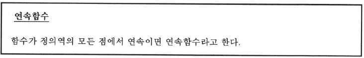 이면, 다시 말해서 $x=b$에서는 왼쪽에서 연속이면 연속이라고 한다. 함수 $f$가 구간의 모든 점에서 연속이면 구간에서 연속이라고 한다. 함수가 정의역의 모든 점에서 연속이면 연속함수(continuous function)라고 한다.