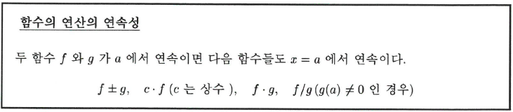함수의 연산으로 구해지는 복잡한 함수의 연속성은 함수의 연산에 대한 극한법칙으로부터 확인할 수 있다. 예를 들어 두 함수 $f$와 $g$가 $a$에서 연속이면