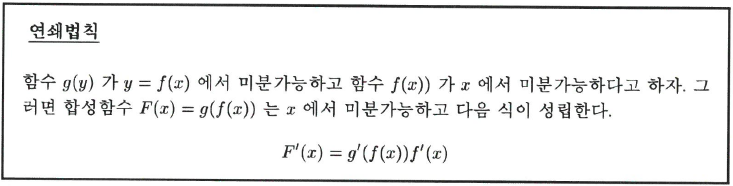 이 성립한다. 합성함수에 대한 이러한 미분법칙을 연쇄법칙(chain rule)이라고 한다.