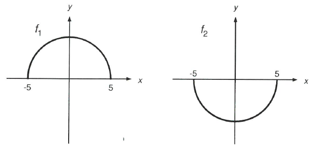 $$f_1(x)=\sqrt{25-x^2},\quad f_2(x)=-\sqrt{25-x^2}$$