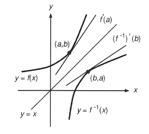 이러한 $f$와 $g=f^{-1}$의 기울기에 대한 역수 관계는 선형함수가 아닌 다른 경우에도 역시 성립한다. 그러나 이 경우 어떤 점에서의 기울기를 고려해야 하는지를 신중히 판단하여야 한다. 점$(a,f(a))$에서 $y=f(x)$의 기울기가 $f'(a)\neq0$ 이라면 점$(f(a),a)$에서 $y=g(x)$의 기울기는 $1/f'(a)$이다. 따라서 $b=f(a)$로 놓으면 $a=g(b)$이고