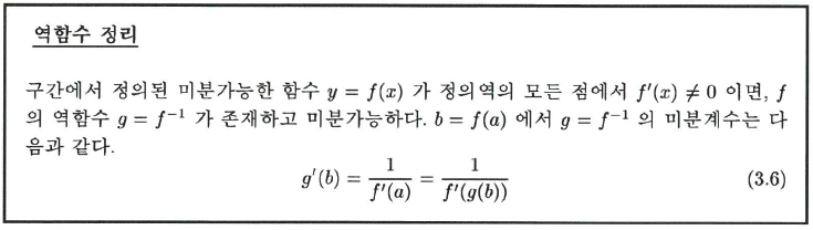 역함수가 존재하고 미분가능하다는 것을 안다면 (3.6)은 음함수의 미분법으로도 쉽게 보일 수 있다. 즉, $g(f(x))=x$이므로 양변을 $x$에 대하여 미분하면