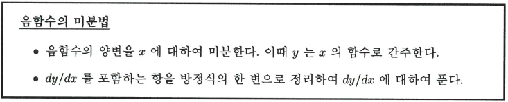 음함수를 양함수 꼴로 바꾸지 않고 미분계수를 구하는 것을 음함수의 미분법(implicit differentiation)이라고 한다. 이 방법을 이용하면 음함수 꼴로 주어진 함수를 양함수 꼴로 바꾸지 않아도 주어진 점에서 미분계수를 구할 수가 있다.