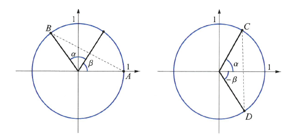 단위원 위의 두 점 A(1,0)과 B($cos(\alpha+\beta), sin(\alpha+\beta)$)사이의 거리는 두 점 C$(cos\alpha, sin\alpha)$와 D$(cos(-\beta), sin(-\beta))=(cos\beta, -sin\beta)$ 사이의 거리와 같다.