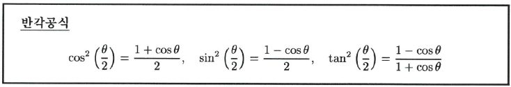 을 얻는다. 이 식들에 $\theta$ 대신 $\theta/2$를 넣은 것을 반각공식이라고 한다.