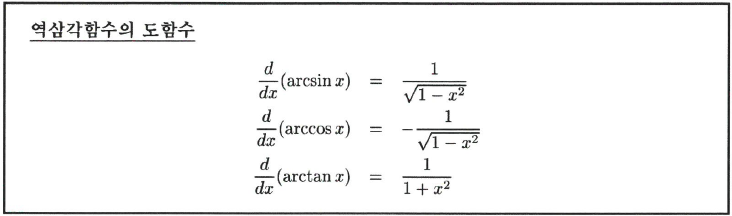 이므로 역함수 정리에 의하여 역사인함수 $y=arcsinx$는 $-1\leq x \leq1$일 때 미분가능하다. 다시 역함수 정리의 결과를