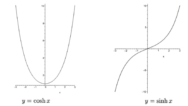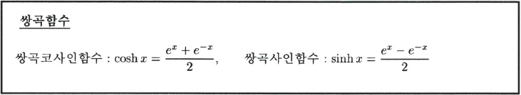 이때 우함수 부분을 쌍곡코사인함수(hyperbolic cosine), 기함수 부분을 쌍곡사인함수(hyperbolic sine)라고 부른다. 지수함수 $e^x$은 무한번 미분가능하므로 쌍곡코사인함수와 쌍곡사인함수도 무한번 미분가능하며