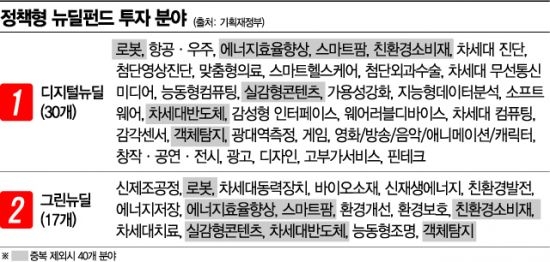 정부는 정책형 뉴딜 펀드의 투자대상 선별과 자산운용에 활용하기 위한 투자 지침을 마련해 9월 말에 발표했습니다. 지침에서는 디지털 분야 30개와 그린 분야 10개 등 총 47개의 197개 품목이 투자대상 예시로 제시됐습니다.