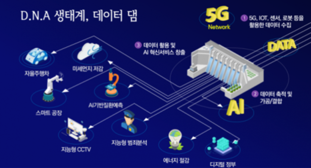다음으로 디지털 뉴딜정책입니다. 포스트 코로나 시대 비 대면화, 디지털 경제 가속화 등 경제 사회 구조 대전이 진행되고 있습니다. 앞으로 이런 세상을 이끌어가는 핵심 요소가 될 겁니다. 디지털 뉴틸은 데이터를 모아 디지털 경제기반으로 데이터 댐을 만드는 것입니다. 디지털 영향을 전 산업 분야의 결합시키는 것이 디지털 뉴딜의 목표입니다. 대표적으로 5G 사물 인터넷에서 로버스를 통해 데이터를 수집해서 가공의 데이터 활용 및 서비스 창출로 이용하는 것입니다.