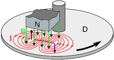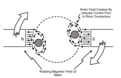 기본원리는 금속판의 한쪽에 자석을 놓고 금속판을 다라 자석을 회전시키면 금속판에 와전류(맴돌이 전류)가 흐르면서 금속판이 자석의 회전 방향으로 움직이게 됩니다. 마찬가지로 말굽자석 사이에 구리 막대로 된 회전자를 넣고 말굽자석을 회전시키면 회전자가 말굽자석이 회전하는 방향을 따라 회전하게 됩니다. 실제 교류 전동기에서는 자석을 돌리지 않고, 가장자리에 코일을 여러 개 설치하여 코일에 흐르는 전류를 변화시켜 코일이 만드는 자기장을 연속적으로 변화시킴으로써 마치 자석이 회전하는 것처럼 자기장을 만들어 회전자를 회전시킵니다.