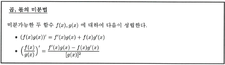 이제 곱의 미분법칙과 식(3.1)을 같이 이용하면 $\frac{f(x)}{g(x)}=f(x)\cdot\frac{1}{g(x)}$의 도함수를 다음과 같이 구할 수 있다.